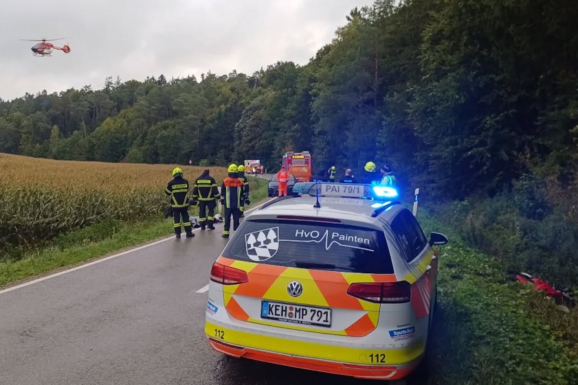 Der 62 Jahre alte Zweirad-Lenker sei infolge des Zusammenstoßes zu Sturz gekommen und habe sich schwere Verletzungen zugezogen. Nach der Erstversorgung vor Ort wurde er zur weiteren Behandlung in ein Krankenhaus gebracht. Der Autofahrer sei unverletzt davongekommen. Das Wildschwein habe den Unfall nicht überlebt, meldet die Polizei. Der insgesamt entstandene Sachschaden wurde im oberen vierstelligen Euro-Bereich angesiedelt. Das Unglück geschah gegen 7.15 Uhr. Neben der Polizei, dem Rettungsdienst und einem Rettungs-Hubschrauber waren ein "Helfer vor Ort" und die Feuerwehr im Einsatz.