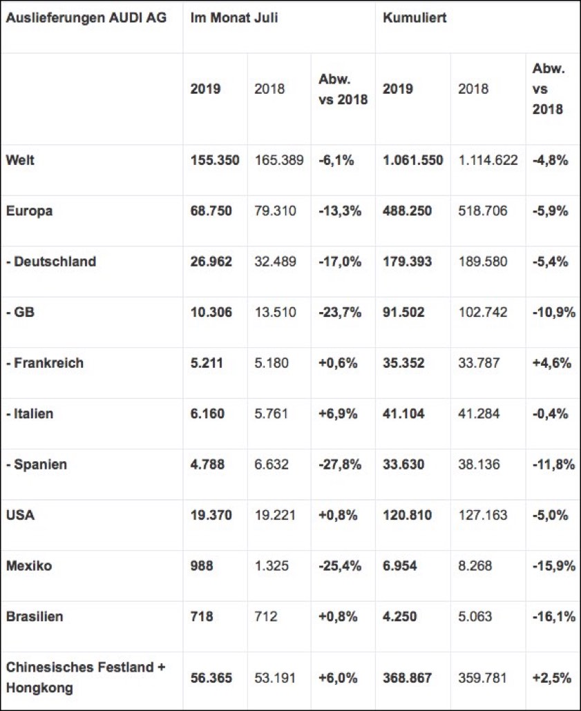 Auch in den USA stiegen die Auslieferungen im Juli. 19 370 Autos standen für ein leichtes Plus von 0,8 Prozent. Weiterhin hoch war die Nachfrage nach den Oberklasse-Modellen A6, A7 und A8. Seit Jahresbeginn summierte sich die Zahl der Auslieferungen auf 120 810 Fahrzeuge (minus 5,0 Prozent). Im ersten Halbjahr hatte sich der Modellwechsel beim Volumenmodell Q3 bremsend ausgewirkt. Die ersten Exemplare des neuen Modells kamen im Laufe des Juli zu den Händlern. Die Region Nordamerika schloss den Juli mit rund 22 850 ausgelieferten Audi-Fahrzeugen (minus 1,3 Prozent), kumuliert lag die Zahl für 2019 bei rund 146.200 Autos (minus 7,5 Prozent).