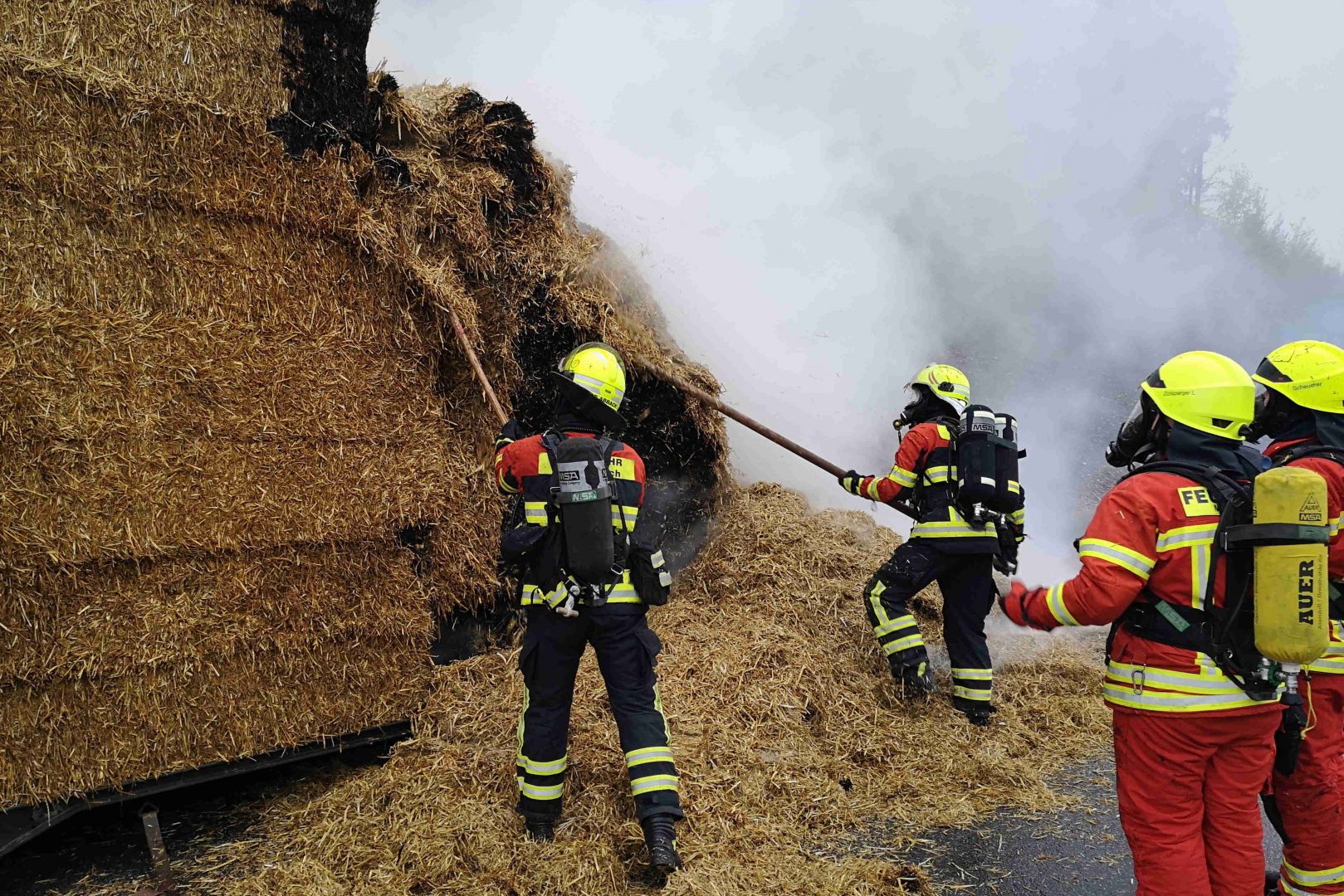 Bei Eintreffen der ersten Einsatzkräfte habe der Lkw-Anhänger bereits zum Teil in Vollbrand gestanden, berichtet die Feuerwehr aus Langquaid, die ebenso alarmiert worden war, wie die Kameraden aus Teugn, Hausen, Bad Abbach, Kelheim und Saalhaupt. Der Lastwagen-Fahrer habe die Zugmaschine noch abhängen können. "Am Anfang wurde das brennende Stroh durch Atemschutzt-Täger mittels Einreißhaken und Dunggabeln vom Anhänger gezogen und abgelöscht", schildert ein Feuerwehr-Sprecher.