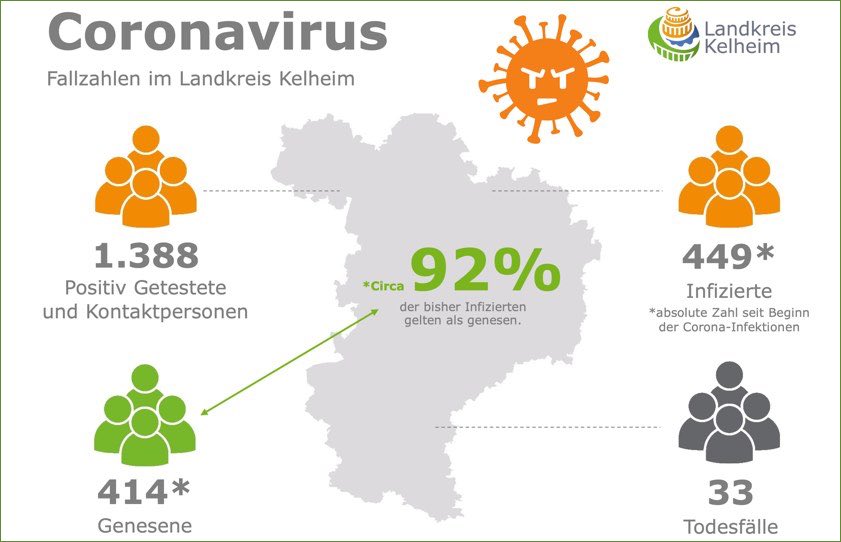 (ty) Im Kreis Kelheim gibt es, wie berichtet, in Zusammenhang mit der Corona-Pandemie bislang 33 Menschenleben zu beklagen. Die Zahl der bestätigten Corona-Fälle hat sich seit gestern nicht erhöht. Unter Verweis auf Daten des Gesundheitsamt teilte das Landratsamt mit, dass – Stand heute, 0 Uhr – die Zahl der im Kreis Kelheim positiv auf das neuartige Virus getesteten Menschen bei insgesamt 449 liegt. 414 hiesige Corona-Patienten – einer mehr als gestern – gelten mittlerweile als genesen und sind aus der Quarantäne entlassen. "Das heißt: Zirka 92 Prozent der bisher Infizierten sind bereits wieder gesund", rechnet die Behörde vor. Oder anders gesagt: Aktuell gibt es nur noch zwei aktive Corona-Fälle im Landkreis.