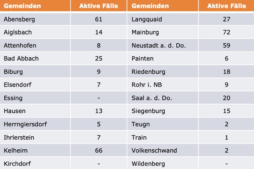 (ty) Im Kreis Kelheim gibt es in Zusammenhang mit der Corona-Pandemie, wie berichtet, mittlerweile 105 Menschenleben zu beklagen. Die weitere Situation stellt sich wie folgt dar: Unter Verweis auf Daten des Gesundheitsamts teilte das Landratsamt heute mit, dass – Stand gestern, 16 Uhr – die Zahl der im Kreis Kelheim positiv auf den neuartigen Erreger getesteten Menschen bei insgesamt 5536 liegt – das sind 35 mehr als gestern gemeldet. Insgesamt 4985 hiesige Corona-Patienten (gestern: 4962) wurden wieder aus der Quarantäne entlassen und gelten als genesen. Derzeit gebe es 446 aktive Corona-Fälle im Landkreis (gestern: 434). Zahlen aus den einzelnen Gemeinden zeigt die Tabelle unten.