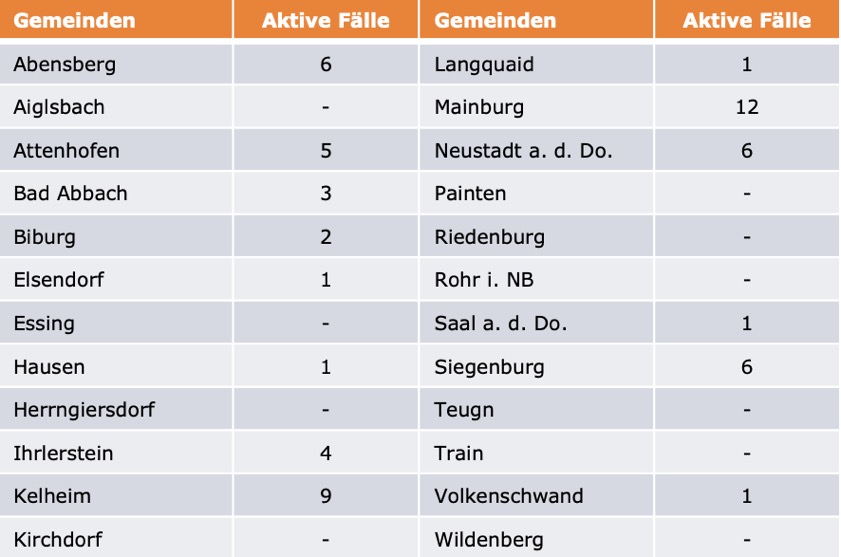 (ty) Im Kreis Kelheim gibt es in Zusammenhang mit der Corona-Pandemie, wie berichtet, mittlerweile 107 Menschenleben zu beklagen. Die weitere Situation stellt sich wie folgt dar: Unter Verweis auf Daten des Gesundheitsamts teilte das Landratsamt heute mit, dass – Stand gestern, 16 Uhr – die Zahl der im Kreis Kelheim positiv auf den neuartigen Erreger getesteten Menschen bei insgesamt 6015 liegt – unverändert seit der gestrigen Meldung. Insgesamt 5850 hiesige Corona-Patienten (gestern: 5849) wurden wieder aus der Quarantäne entlassen und gelten als genesen. Derzeit gebe es 58 aktive Corona-Fälle im Landkreis (gestern: 59). Zahlen aus den einzelnen Gemeinden zeigt die Tabelle unten. Mittlerweile gelten massive Lockerungen der Corona-Regeln.