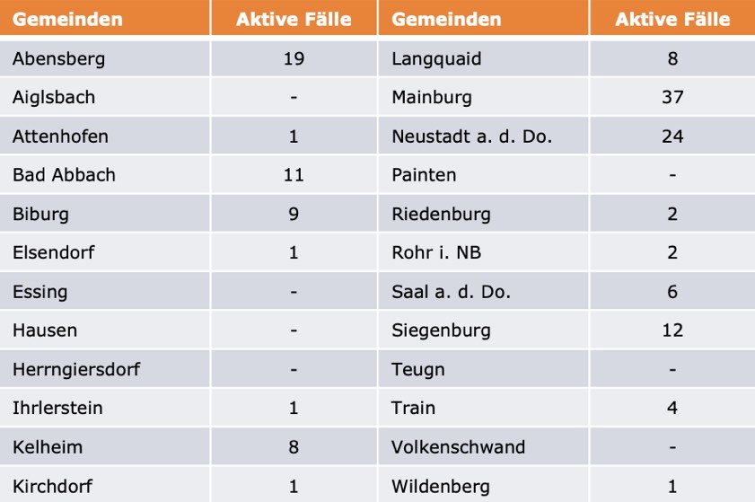 (ty) Im Kreis Kelheim gibt es in Zusammenhang mit der Corona-Pandemie, wie berichtet, mittlerweile 110 Menschenleben zu beklagen. Die weitere Situation stellt sich wie folgt dar: Unter Verweis auf Daten des Gesundheitsamts teilte das Landratsamt heute mit, dass – Stand gestern, 16 Uhr – die Zahl der im Kreis Kelheim positiv auf den neuartigen Erreger getesteten Menschen bei insgesamt 6275 liegt: Das sind 17 mehr als gestern gemeldet (Vortage: plus 19, plus 19, plus 17). Insgesamt 6018 hiesige Corona-Patienten (gestern: 6013) wurden wieder aus der Quarantäne entlassen und gelten als genesen. Derzeit gebe es 147 aktive Corona-Fälle im Landkreis (gestern: 135). Zahlen aus den einzelnen Gemeinden zeigt die Tabelle unten. Inzidenz-bedingt gelten im Landkreis seit 23. August strengere Regeln, weitere Verschärfungen greifen ab 31. August.