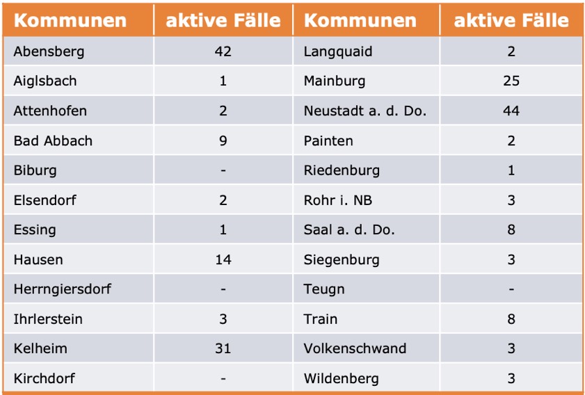 (ty) Im Kreis Kelheim gibt es in Zusammenhang mit der Corona-Pandemie, wie berichtet, mittlerweile 110 Menschenleben zu beklagen. Die weitere Situation stellt sich wie folgt dar: Unter Verweis auf Daten des Gesundheitsamts teilte das Landratsamt heute mit, dass – Stand gestern, 16 Uhr – die Zahl der im Kreis Kelheim positiv auf den neuartigen Erreger getesteten Menschen bei insgesamt 6788 liegt: Das sind zwölf mehr als gestern gemeldet. Insgesamt 6471 hiesige Corona-Patienten (gestern: 6444) wurden wieder aus der Quarantäne entlassen und gelten als genesen. Derzeit gebe es 207 aktive Corona-Fälle im Landkreis (gestern: 222). Zahlen aus den einzelnen Gemeinden zeigt die Tabelle unten. Seit 2. September gelten bayernweit völlig neue Corona-Regeln (Details siehe unten).