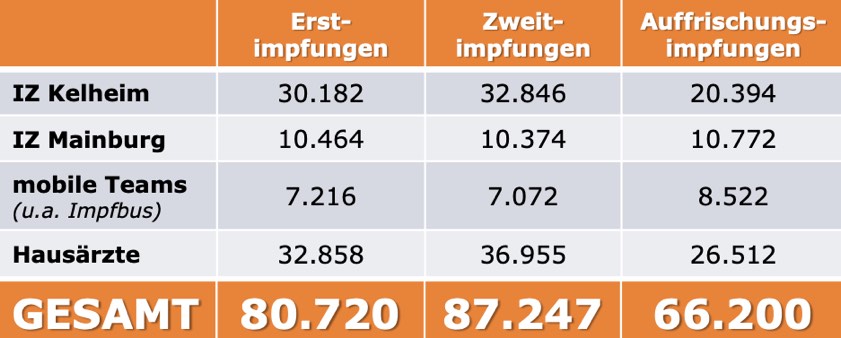 Die obige Tabelle zeigt die jüngsten offiziellen Infos aus dem Landratsamt zu den verabreichten Corona-Impfungen im Kreis Kelheim. Dazu zwei Anmerkungen: 1. Wer den Impfstoff von "Johnson & Johnson" erhalten hat, braucht bekanntlich nur eine Impfung; diese Personen werden in der Statistik nur bei den Zweit-Impfungen geführt. 2. Das Impf-Zentrum in Mainburg war von Ende September 2021 bis 20. November 2021 geschlossen.