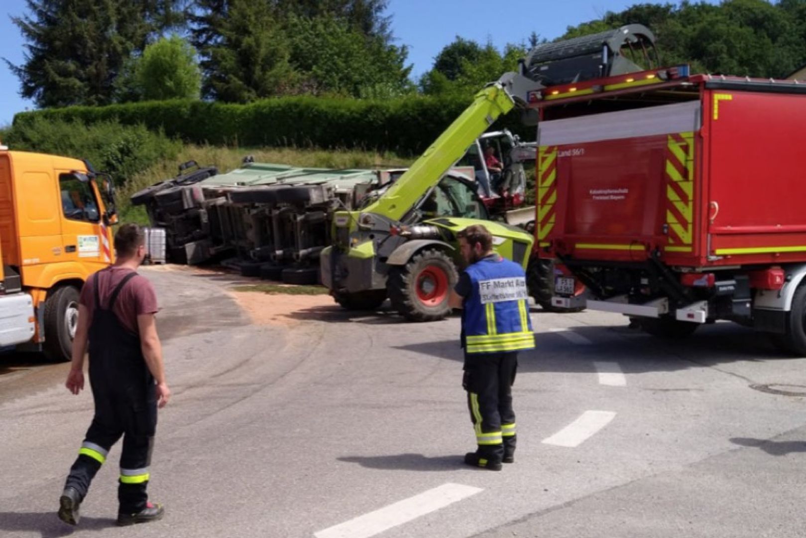 In einer B301-Kurve in Enzelhausen kippte das mit Gras-Silage beladene Gespann nach rechts um. Aufwändige Bergungs-Maßnahmen.